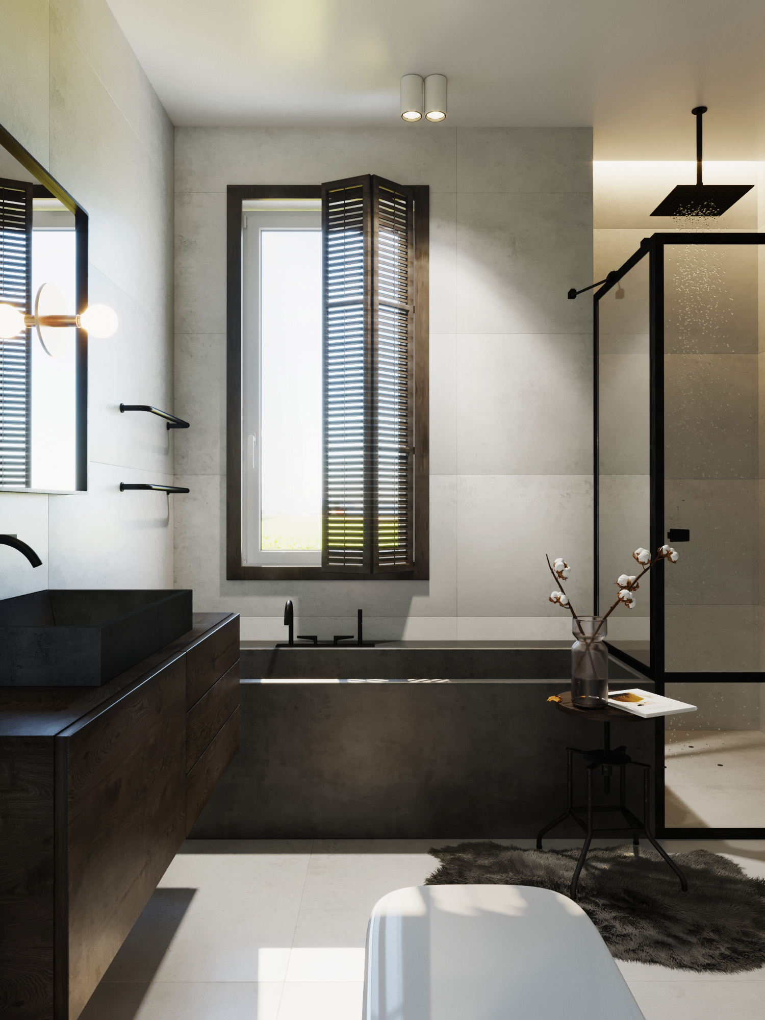 Spośród dwóch łazienek, w jednej zapanował elegancki minimalizm, do drugiej zaś zakradł się nasz bajkowy motyw. Pierwsza z nich to połączenie bieli i hebanu oraz wyselekcjonowane, jakościowe materiały tworzące z niej ekskluzywną przestrzeń sprzyjającą relaksowi. Największe wrażenie robi duża, czarna bryła kamiennej wanny ustawionej bezpośrednio pod oknem.