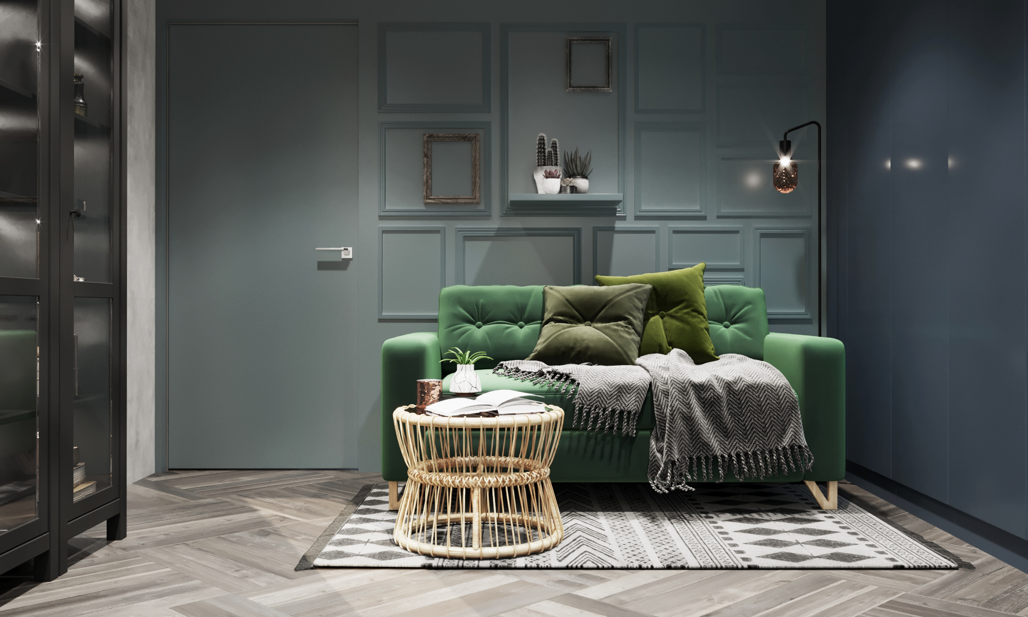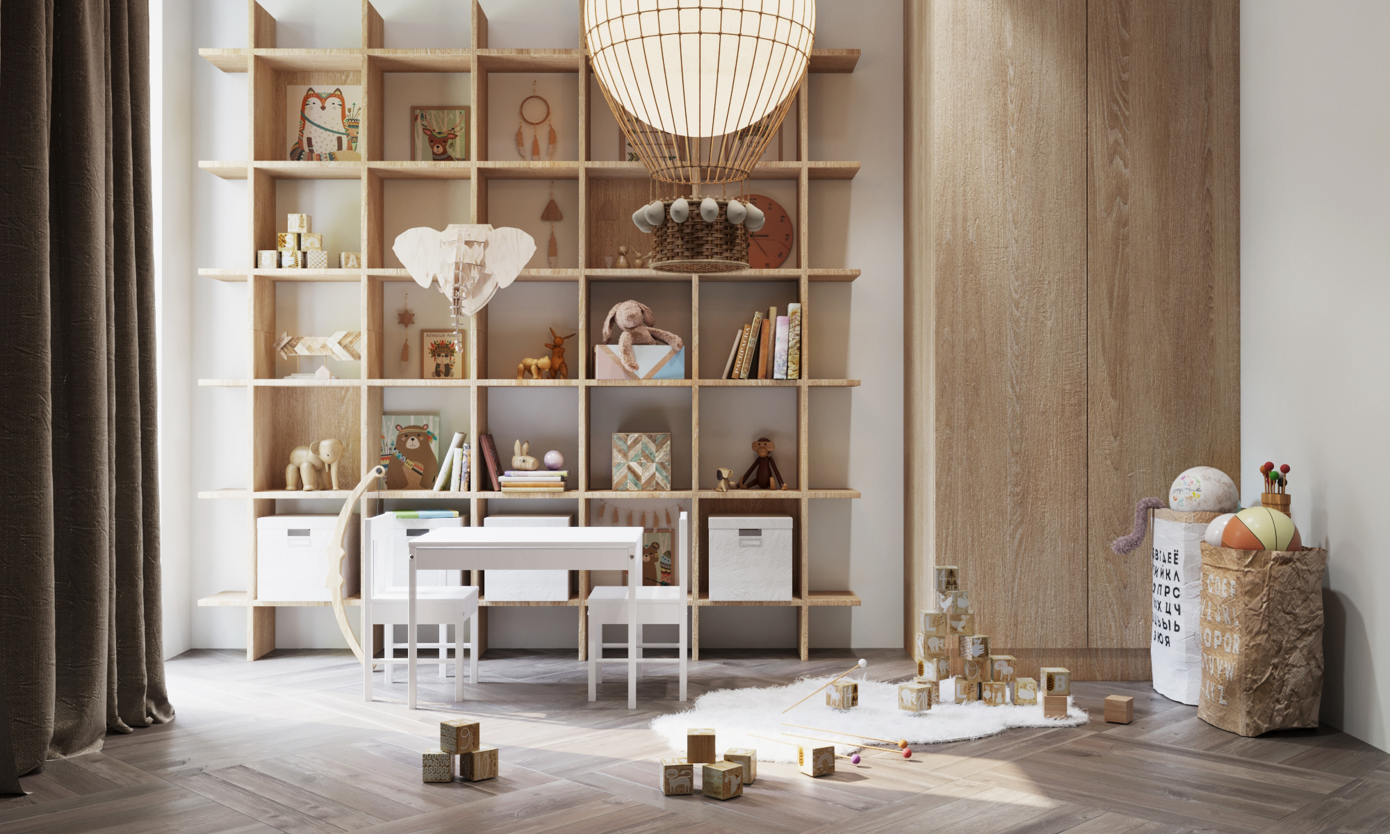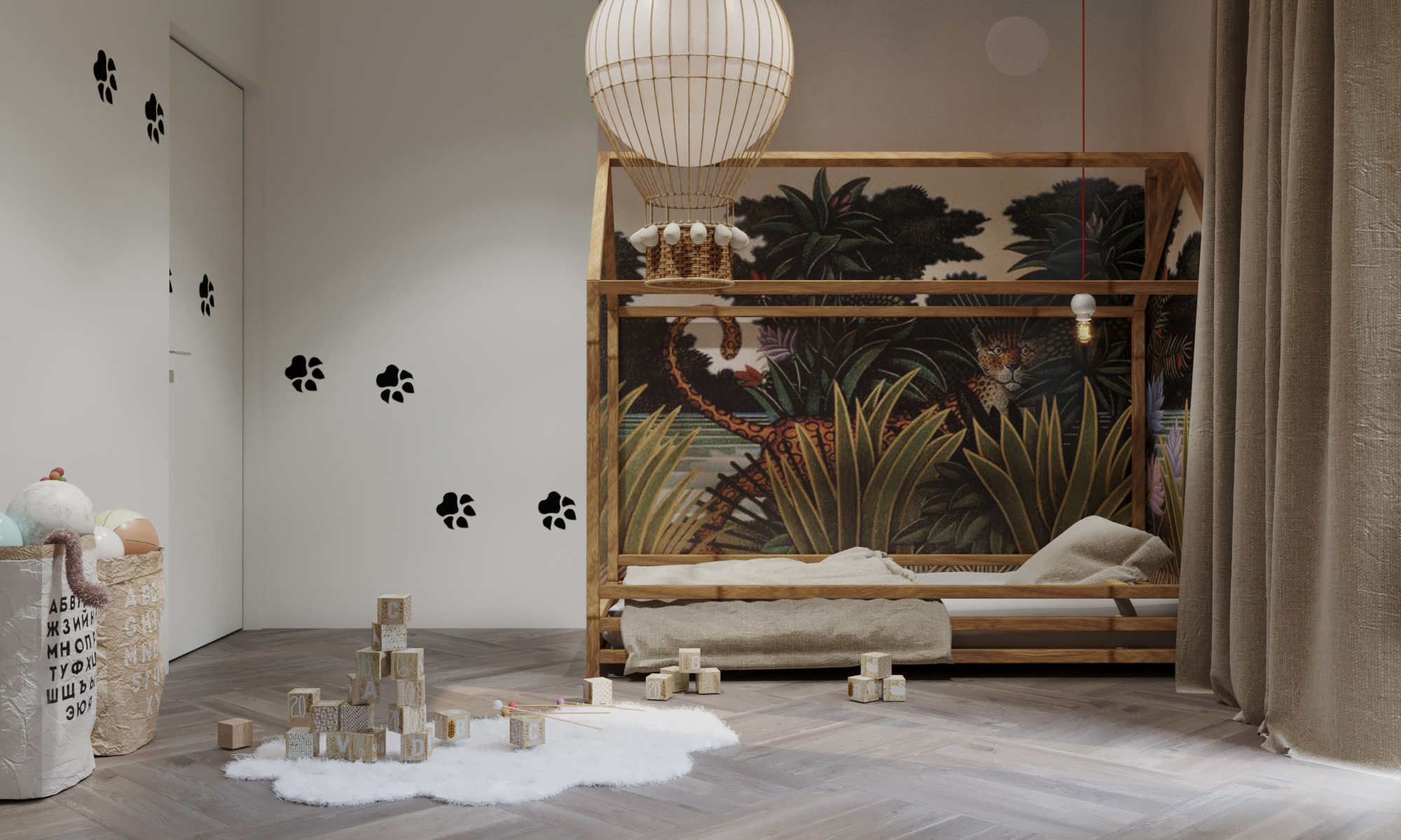 Dziecięcy pokój łączy w sobie skandynawską prostotę i dzikość dżungli. Egzotyczny obraz i regał pełen miejsca na dziecięce malunki zostały stworzone z myślą o rozwijaniu dziecięcej kreatywności. Jednocześnie zostawiliśmy sporo przestrzeni na inwencję twórczą najmłodszych.