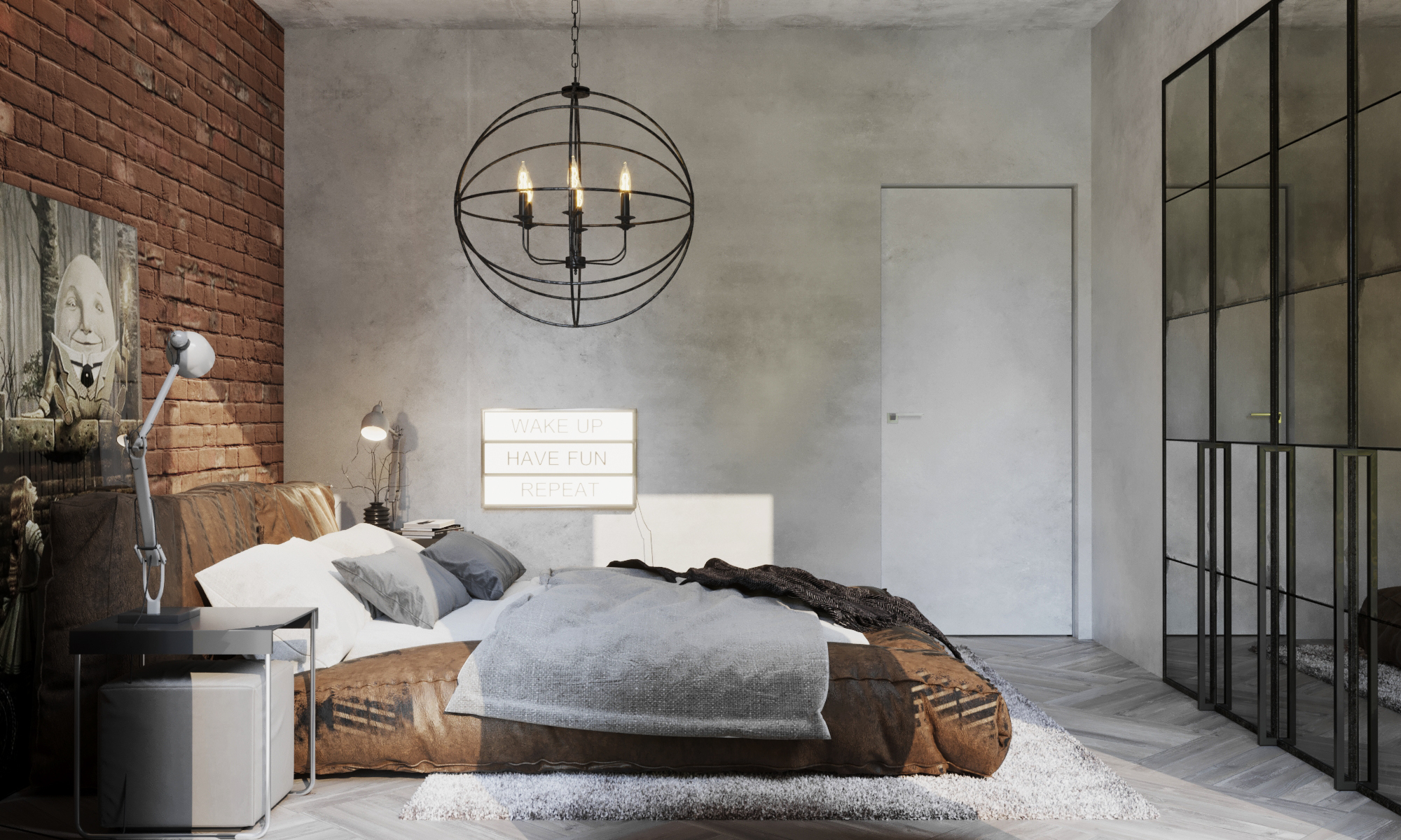 Beton znalazł także zastosowanie w sypialni, jako kontrast do naturalnej cegły i wykończonego skórą łóżka w ciepłym odcieniu brązu. Podobnie jak w salonie, bryła żyrandola jest zamknięta w stalowej, dekoracyjnej kuli, a na ścianach pojawiły się bajkowe motywy.