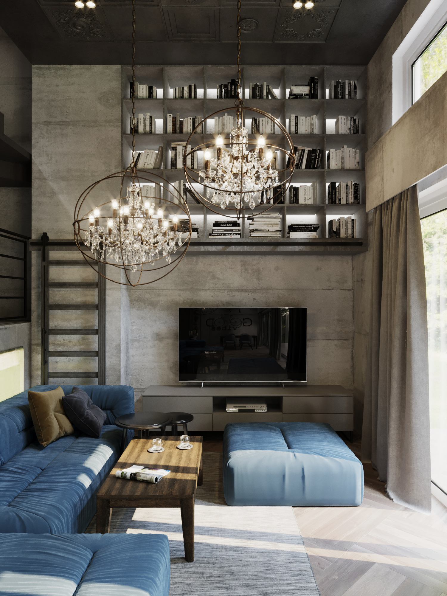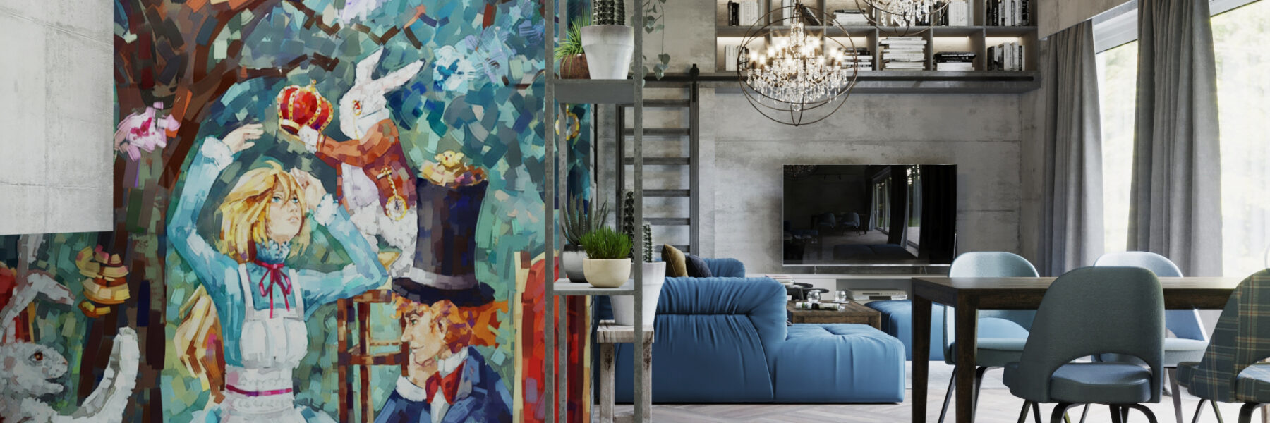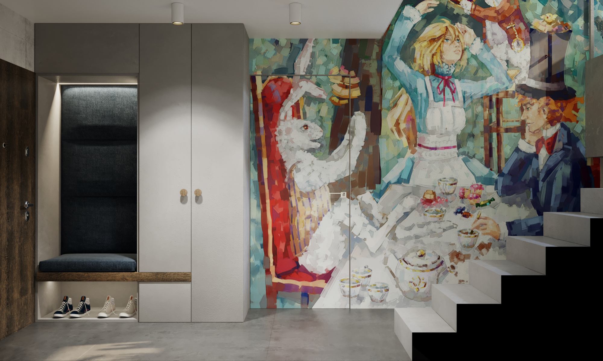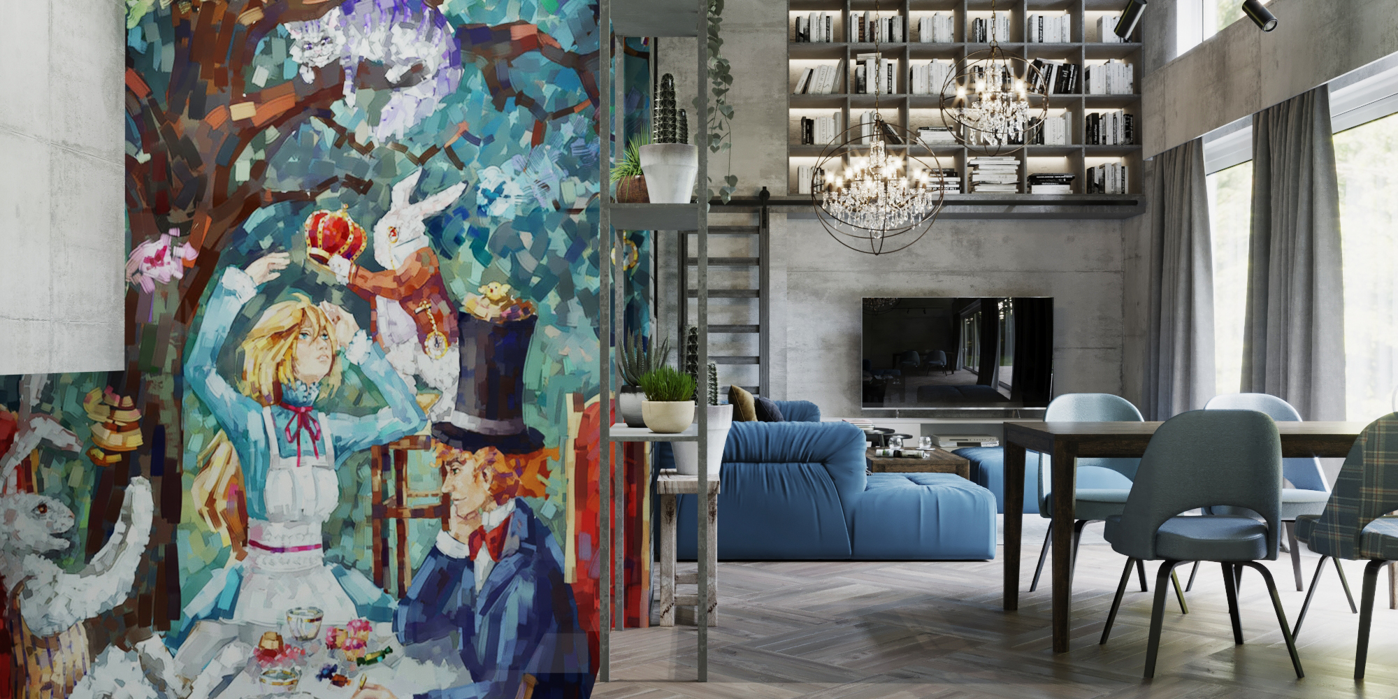 Abstrakcyjne malowidło nawiązujące do historii Alicji w Krainie Czarów w przedsionku domu to najbardziej przykuwający wzrok element projektu. Zaczyna ono opowiadać historię, która będzie się ciągnąć przez wszystkie pomieszczenia. Neutralne kolory, beton i drewno to wybory mające na celu oddać wyjątkowym dodatkom więcej przestrzeni. Sercem salonu jest duża niebieska sofa, nad którą górują fantazyjne kryształowe żyrandole zamknięte w geometrycznych złotych kulach. Dla oszczędności miejsca, biblioteczka znajduje się ponad głowami domowników i jest zaopatrzona w ruchomą drabinę.