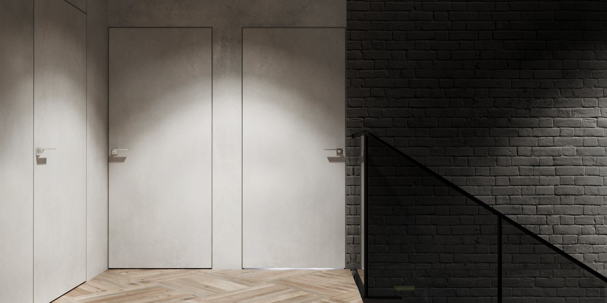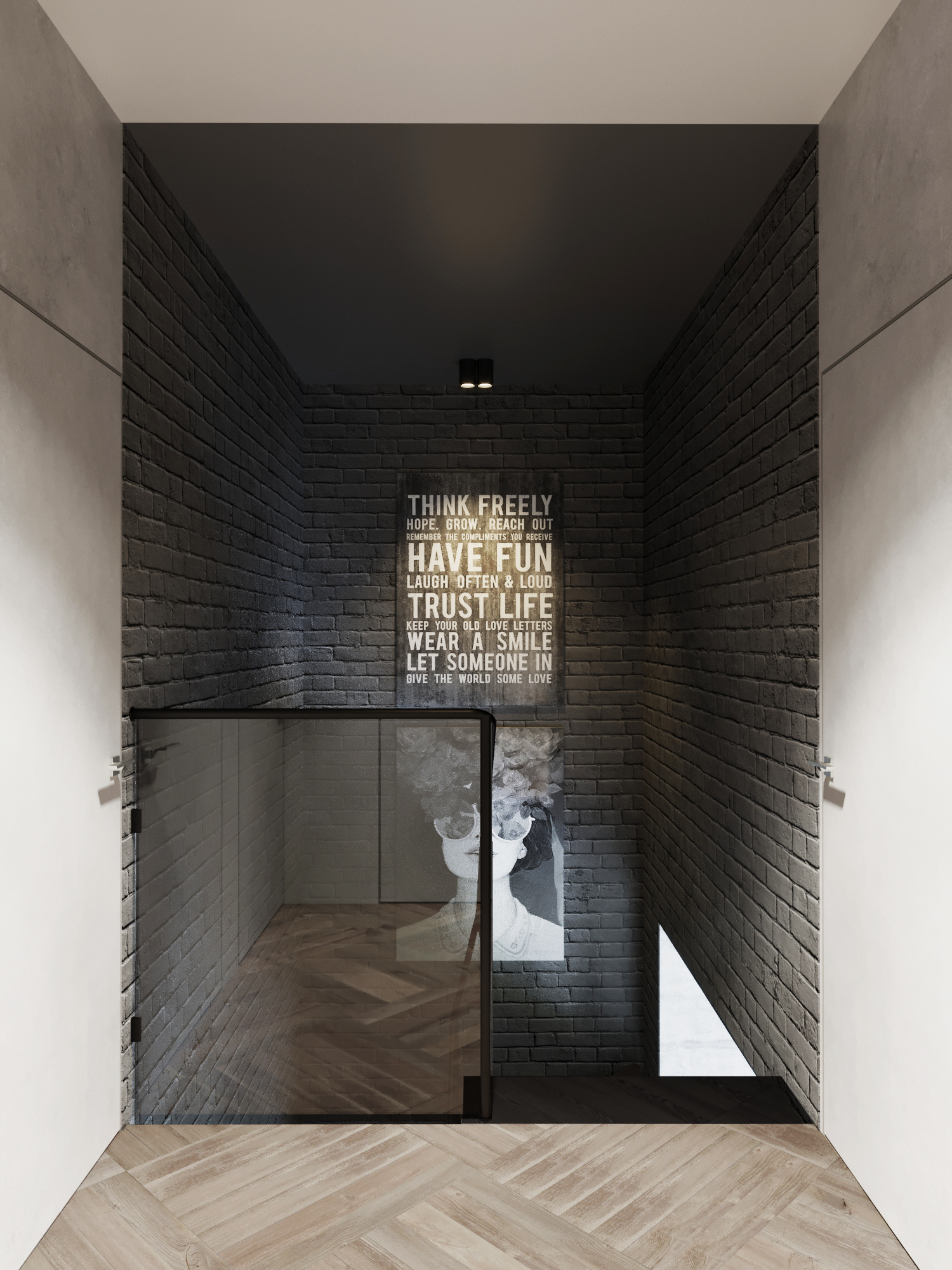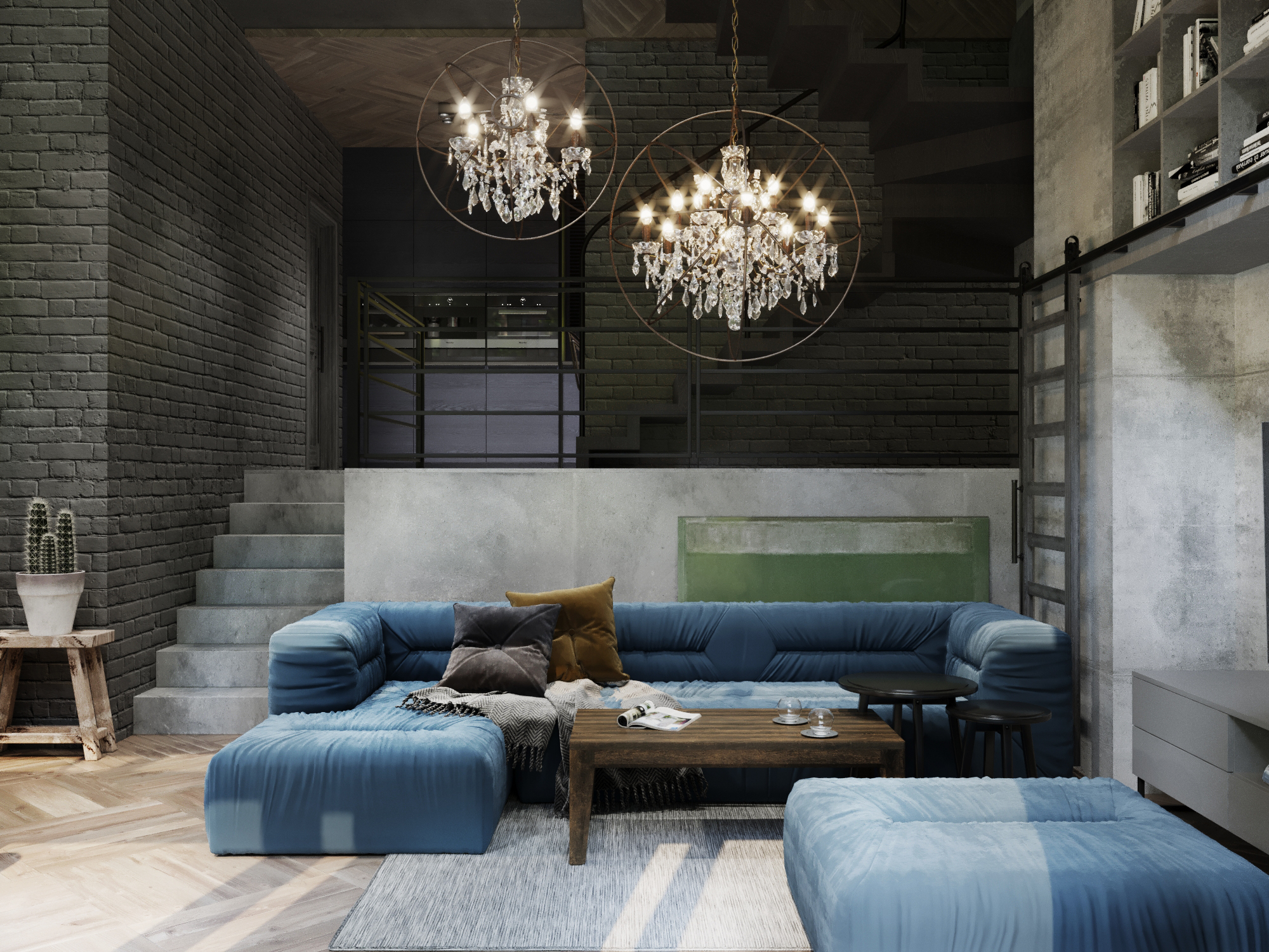 Abstrakcyjne malowidło nawiązujące do historii Alicji w Krainie Czarów w przedsionku domu to najbardziej przykuwający wzrok element projektu. Zaczyna ono opowiadać historię, która będzie się ciągnąć przez wszystkie pomieszczenia. Neutralne kolory, beton i drewno to wybory mające na celu oddać wyjątkowym dodatkom więcej przestrzeni. Sercem salonu jest duża niebieska sofa, nad którą górują fantazyjne kryształowe żyrandole zamknięte w geometrycznych złotych kulach. Dla oszczędności miejsca, biblioteczka znajduje się ponad głowami domowników i jest zaopatrzona w ruchomą drabinę.