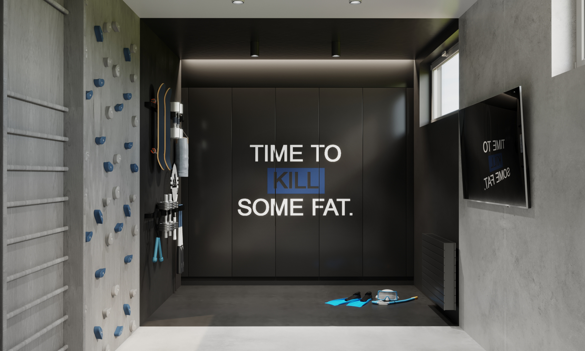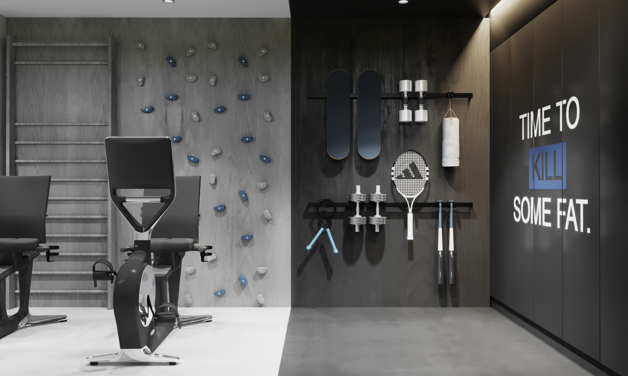 Wyjątkowym elementem domu jest prywatna, minimalistyczna siłownia ze ścianką wspinaczkową. Umieszczenie sprzętów na ścianach pozwoliło zaoszczędzić miejsce, dzięki czemu można tu zorganizować trening we dwoje.