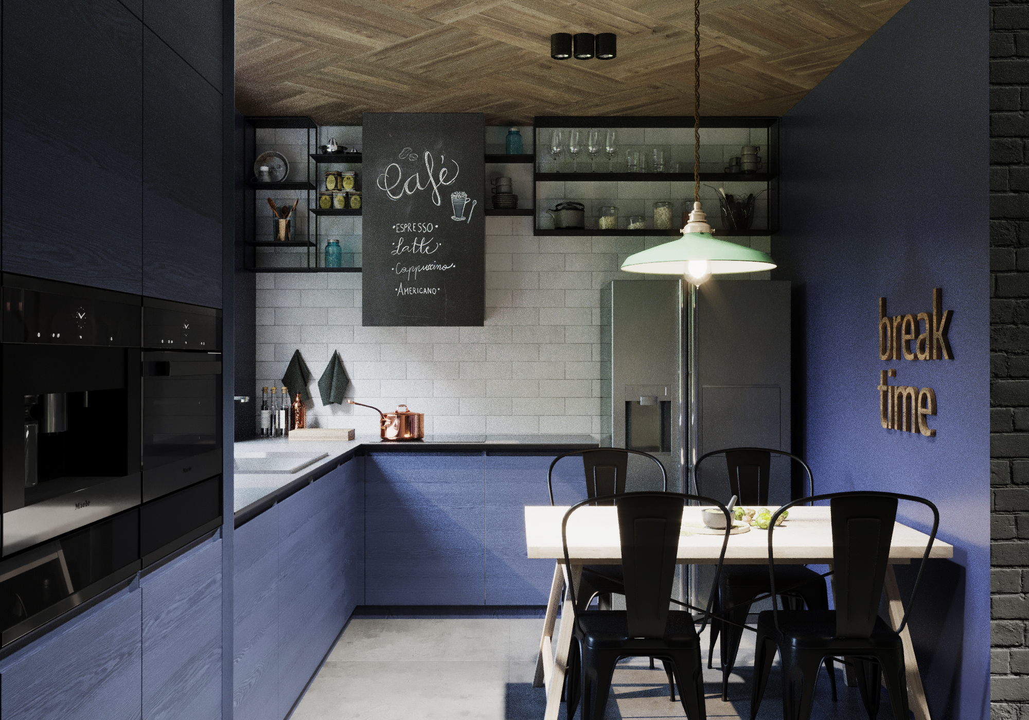 Kuchnia jest umieszczona na podwyższeniu przy salonie, więc połączyliśmy oba pomieszczenia także paletą barw. Dla nieoczywistego nawiązania do bajkowego świata, sufit został wykończony panelami podłogowymi, kontrastującymi dodatkowo z jasną podłogą. Niewielka przestrzeń została odciążona otwartymi półkami i białymi kaflami.
