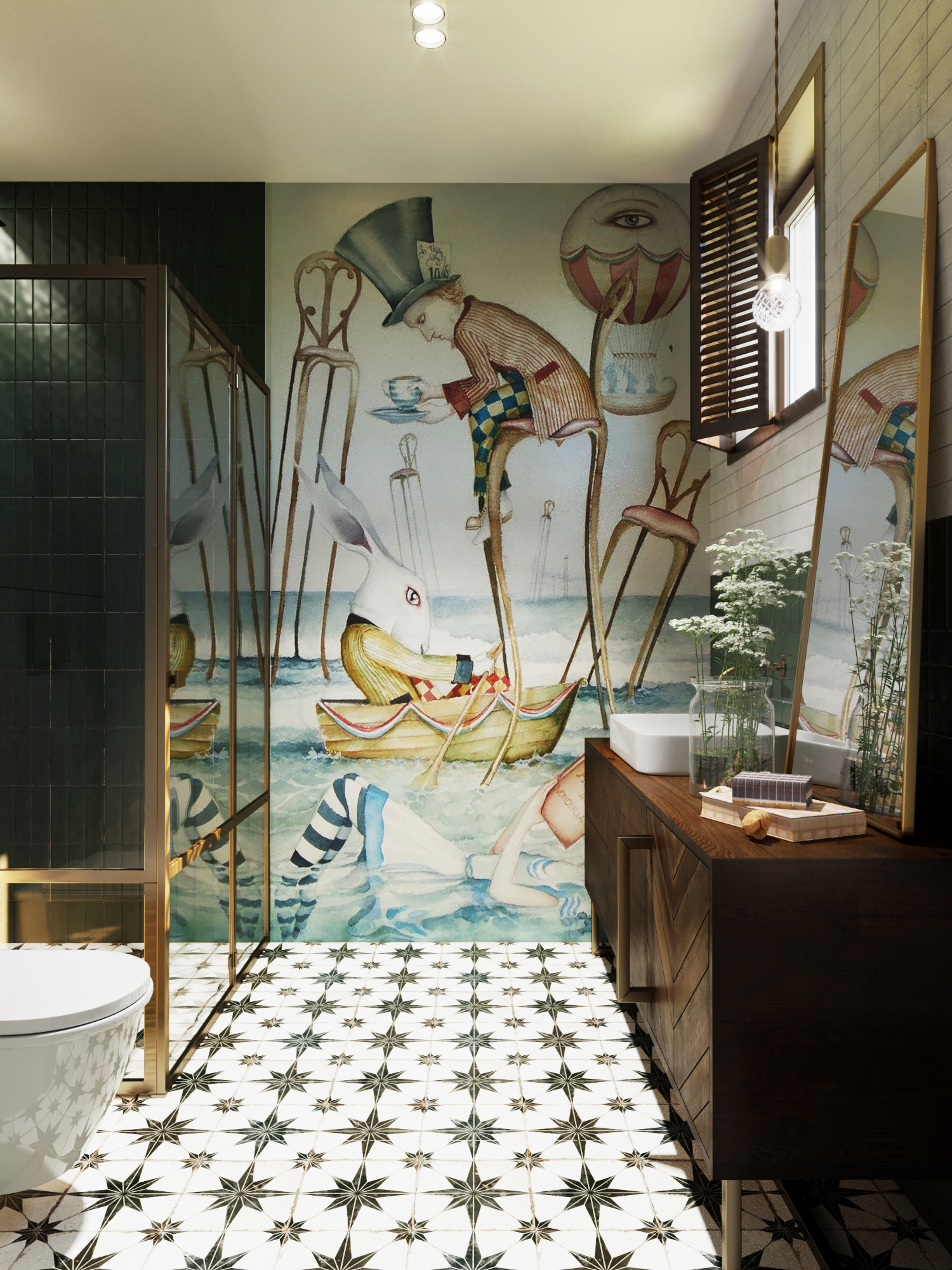 Druga z łazienek to przestrzeń do wielopoziomowej interpretacji. Wzory, kolory, luźne dodatki i kąpiel w złocie, a to wszystko pod skrzydłami kolejnego wyjątkowego malowidła nawiązującego do wspomnianej wcześniej Krainy Czarów. Mimo radosnego, pełnego wrażeń charakteru wnętrze jest przemyślane i spójne.