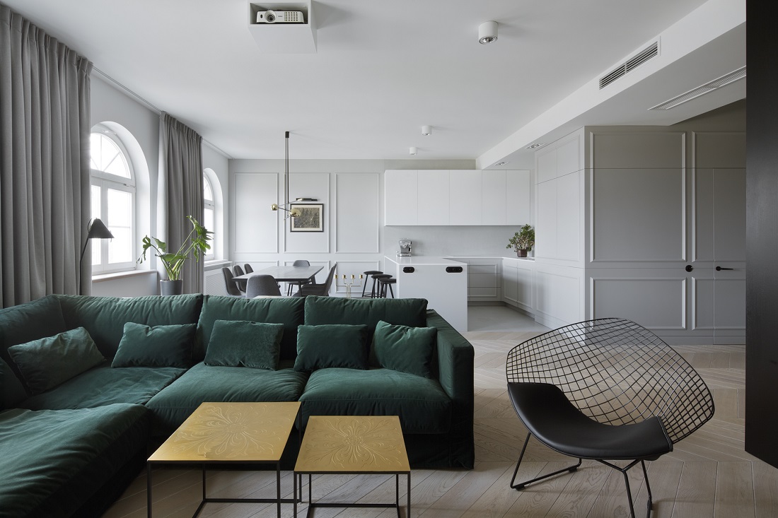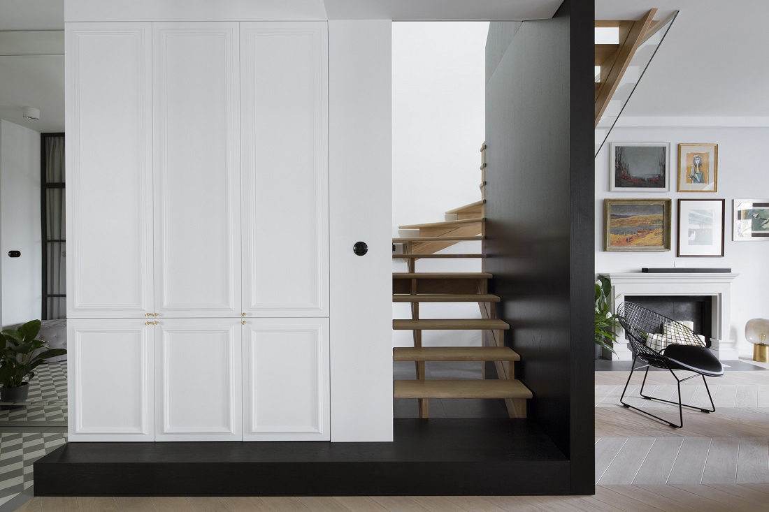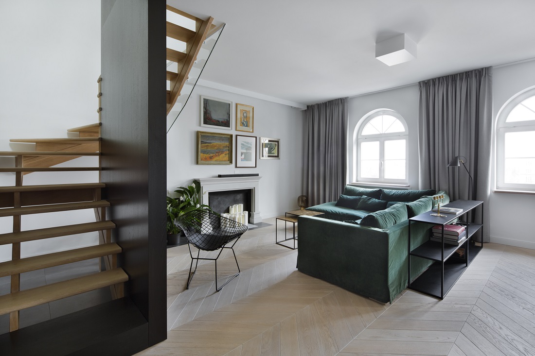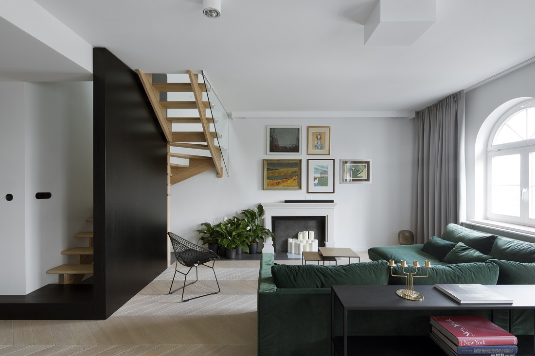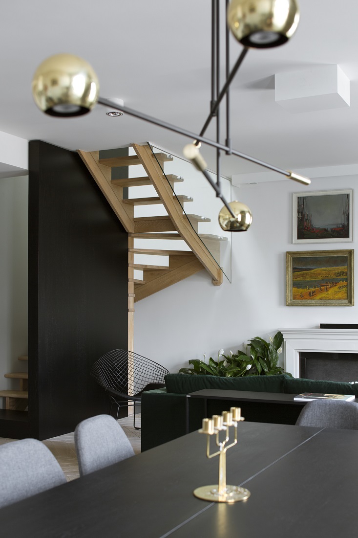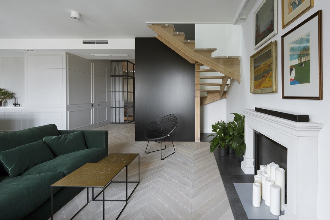 Projekt dwupoziomowego apartamentu na warszawskich filtrach. Projekt miał okazję ukazać się na łamach wielu czasopism oraz portali wnętrzarskich.