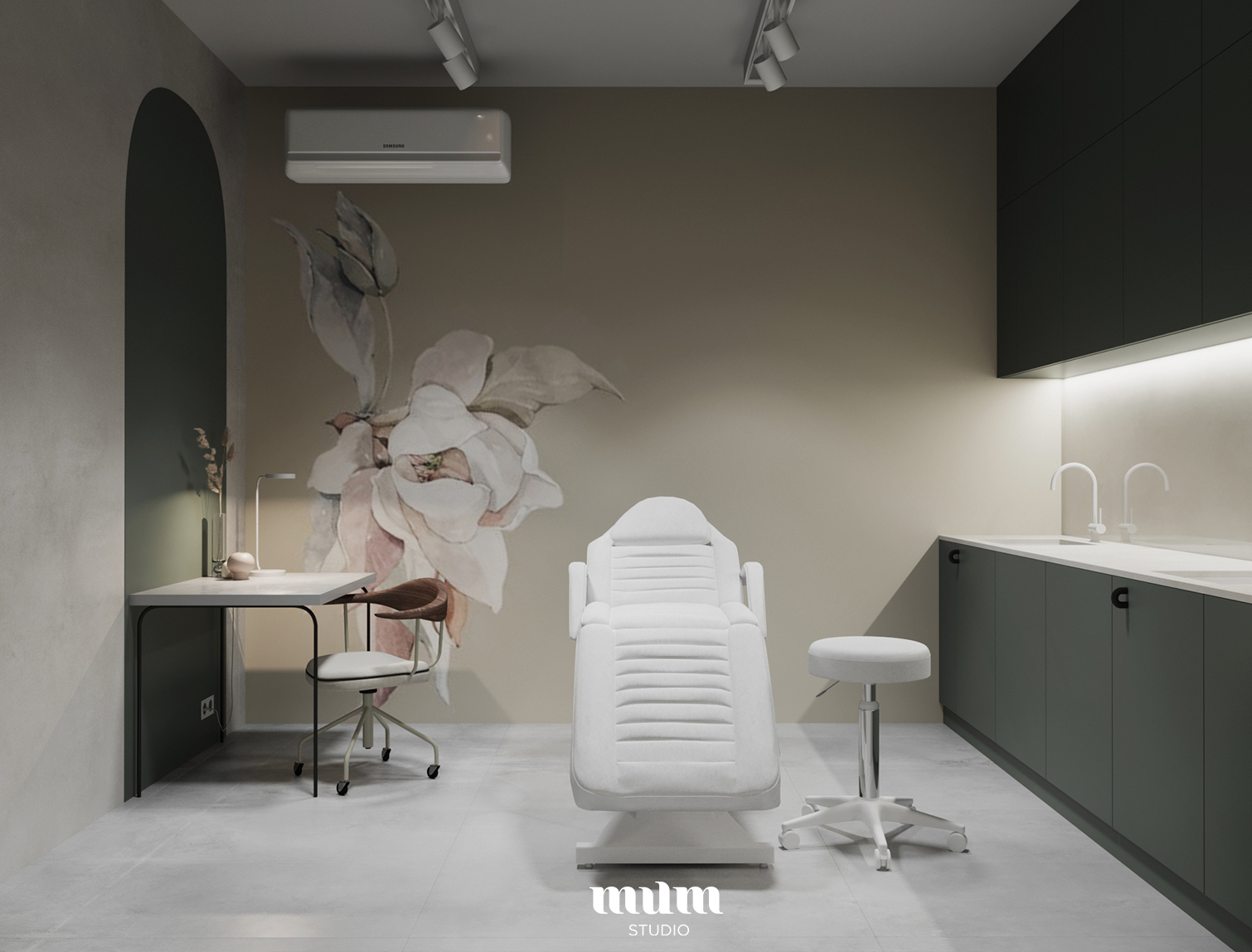 Samo pomieszczenie gabinetu to minimalistyczne, spokojne wnętrze skupione na funkcjonalności. Dla ocieplenia przestrzeni pracy zostały wprowadzone bezproblemowe elementy dekoracyjne- gra kolorów ścian, malunek nawiązujący do detali w recepcji czy nietuzinkowe krzesło przełamane drewnianym oparciem, przykuwającym wzrok na tle matowych, minimalistycznych powierzchni. Użycie ciemnej, złamanej zieleni miało za zadanie nadać gabinetowi intymnego, przytulnego klimatu i ułatwić jego gościom relaks.
