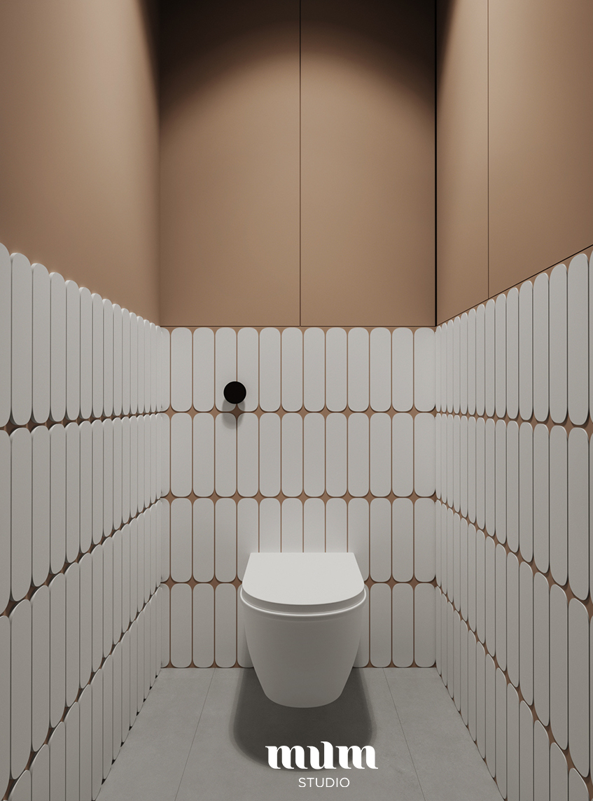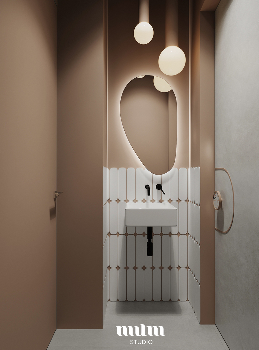 Niewielka przestrzeń toalety została uwypuklona geometrycznymi dodatkami. Brązy, miedź, owalne płytki i lustro to połączenie dające uczucie miękkości i otwierające ciasną perspektywę.