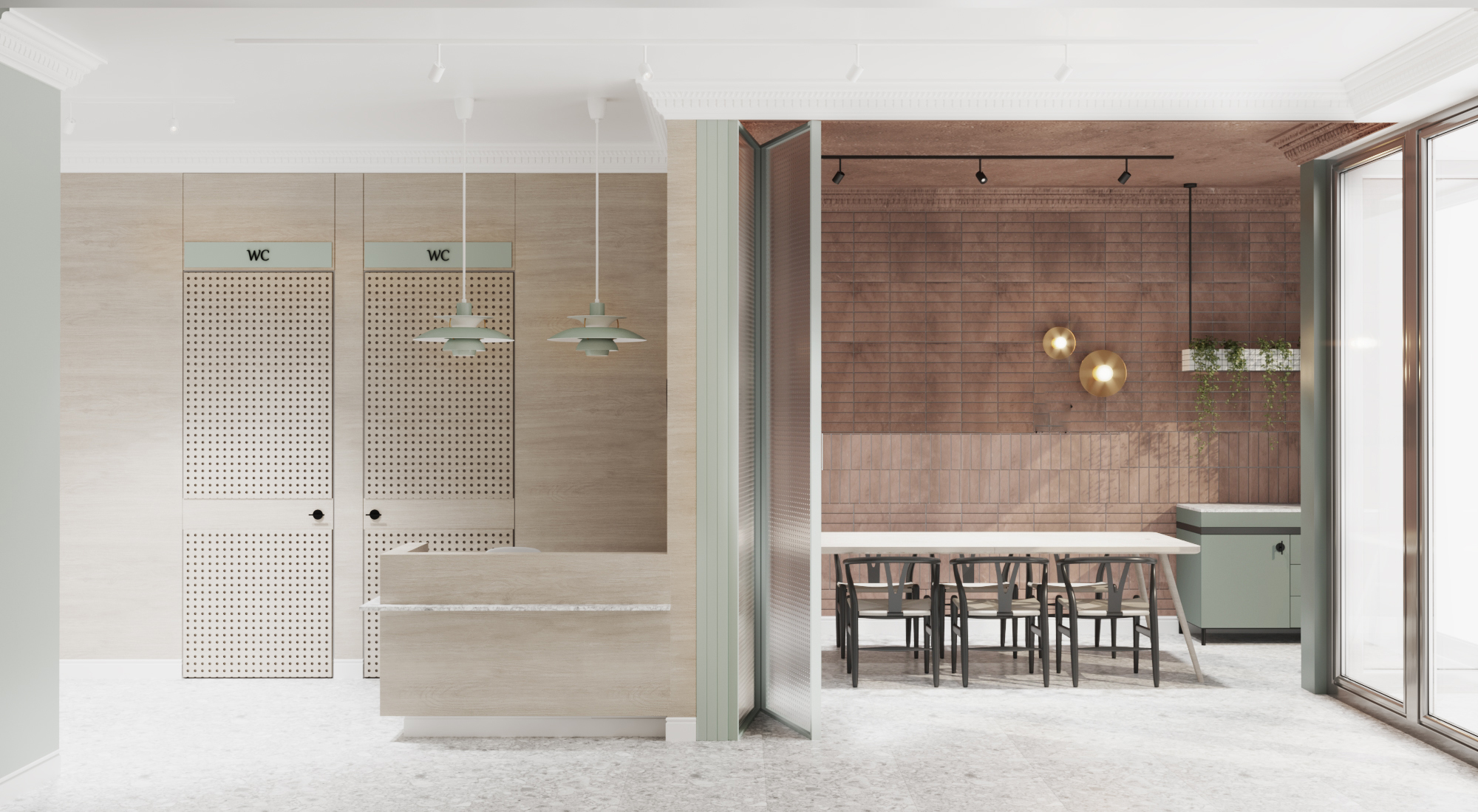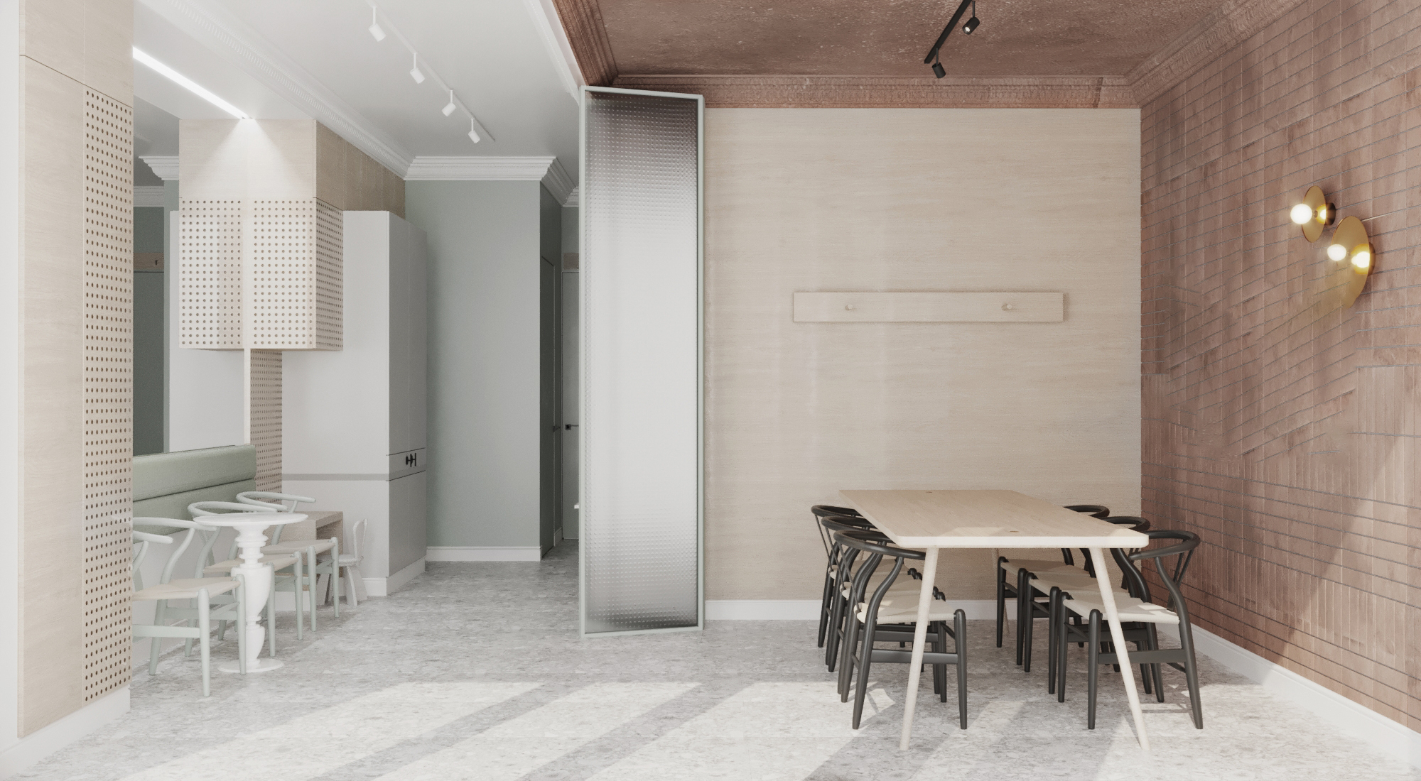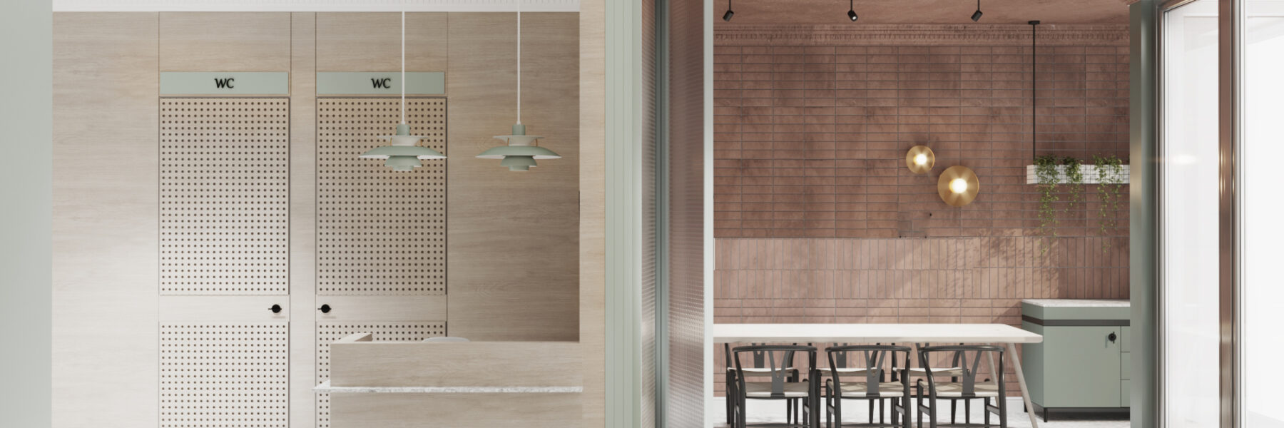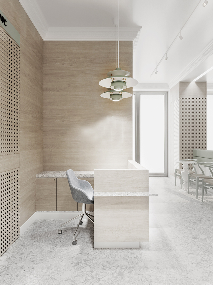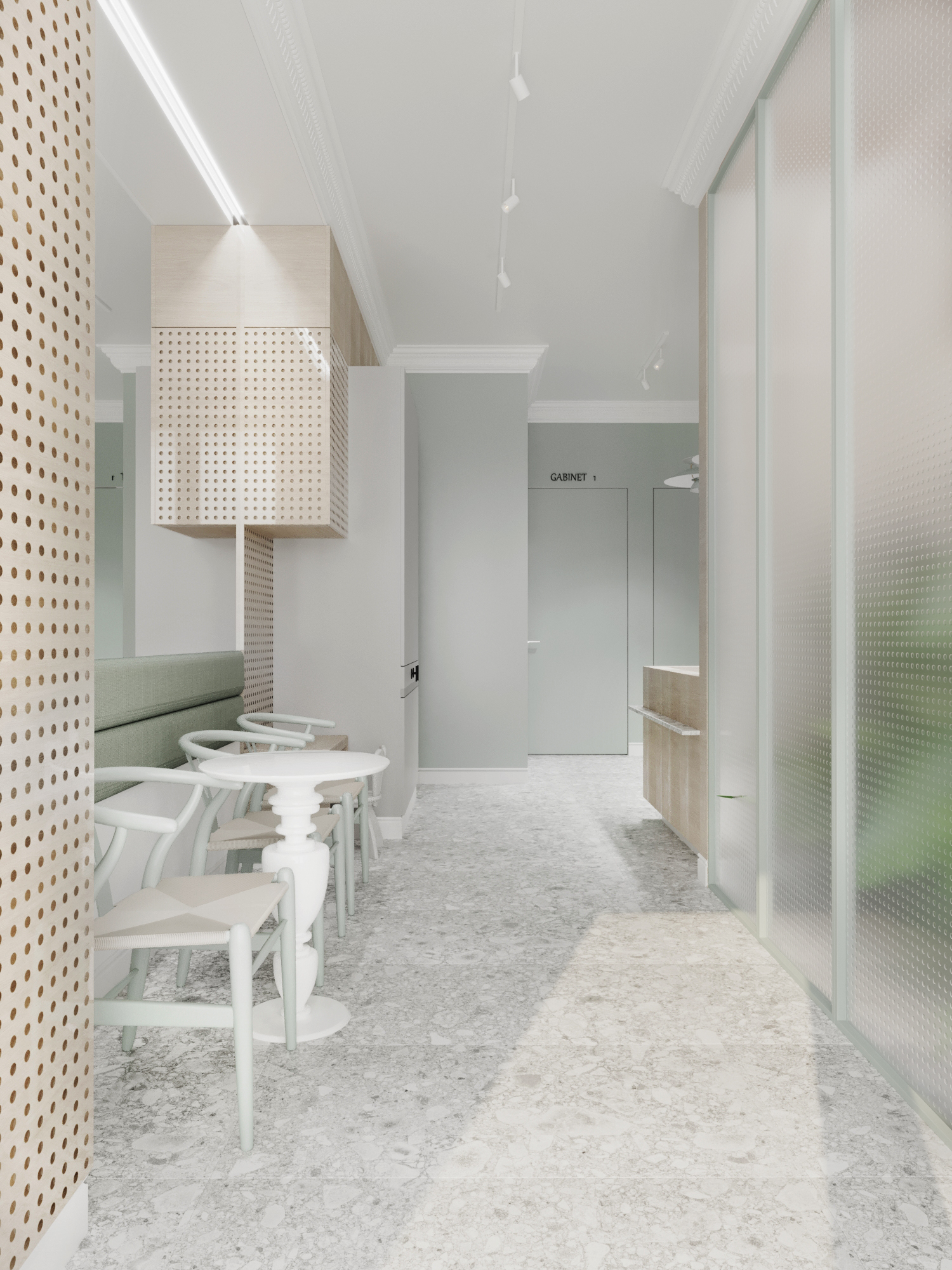 Projekt gabinetów lekarskich o powierzchni 90 m2. Dbamy o to aby każdy projekt gabinetów wychodził poza standardowy schemat estetyki. Tym razem postawiliśmy na delikatne barwy które dają poczucie przytulności i spokoju. Połączenie delikatnych kolorów z naturalnym drewnem oraz cegłą na ścianie w sali szkoleniowej.