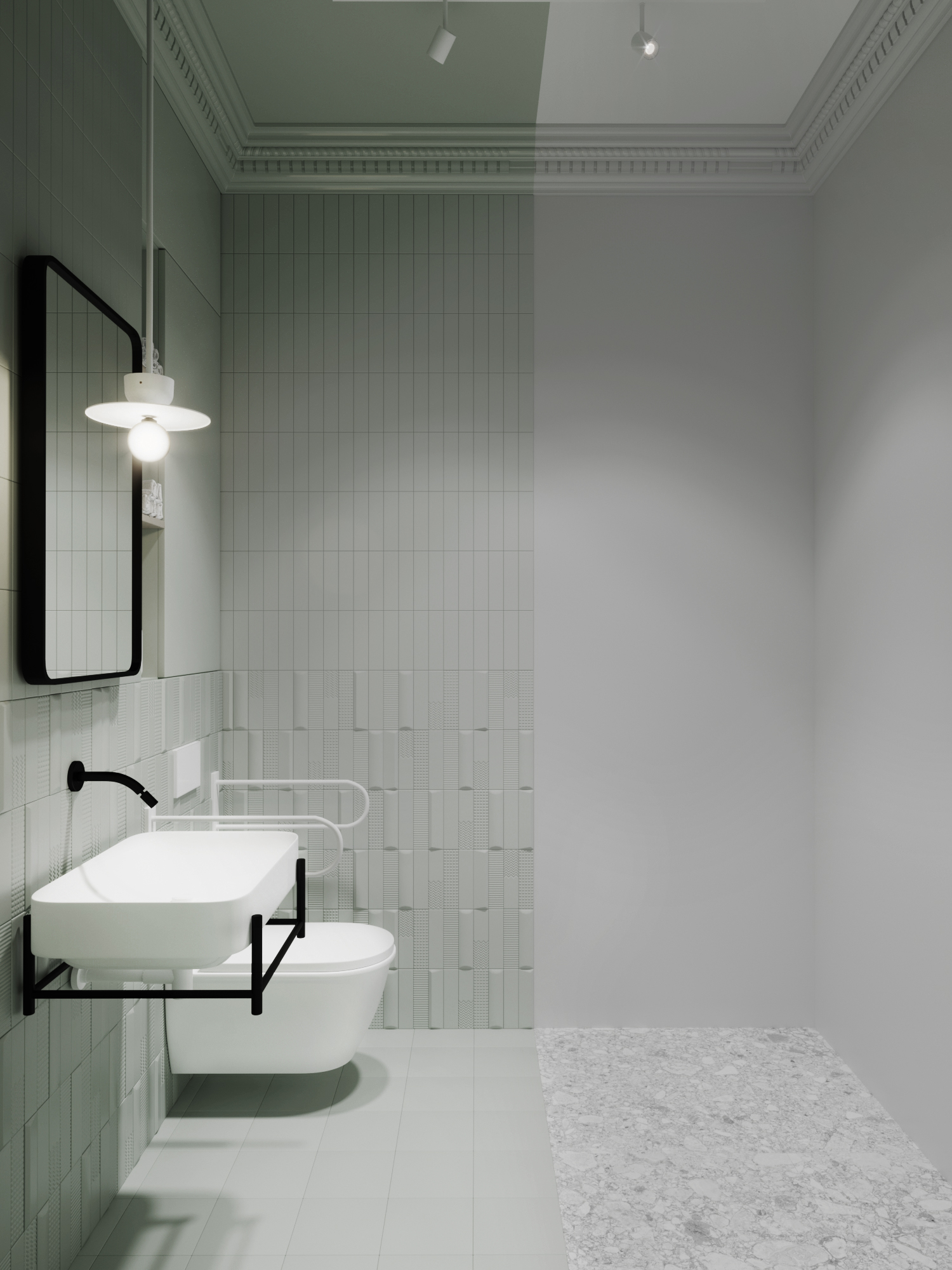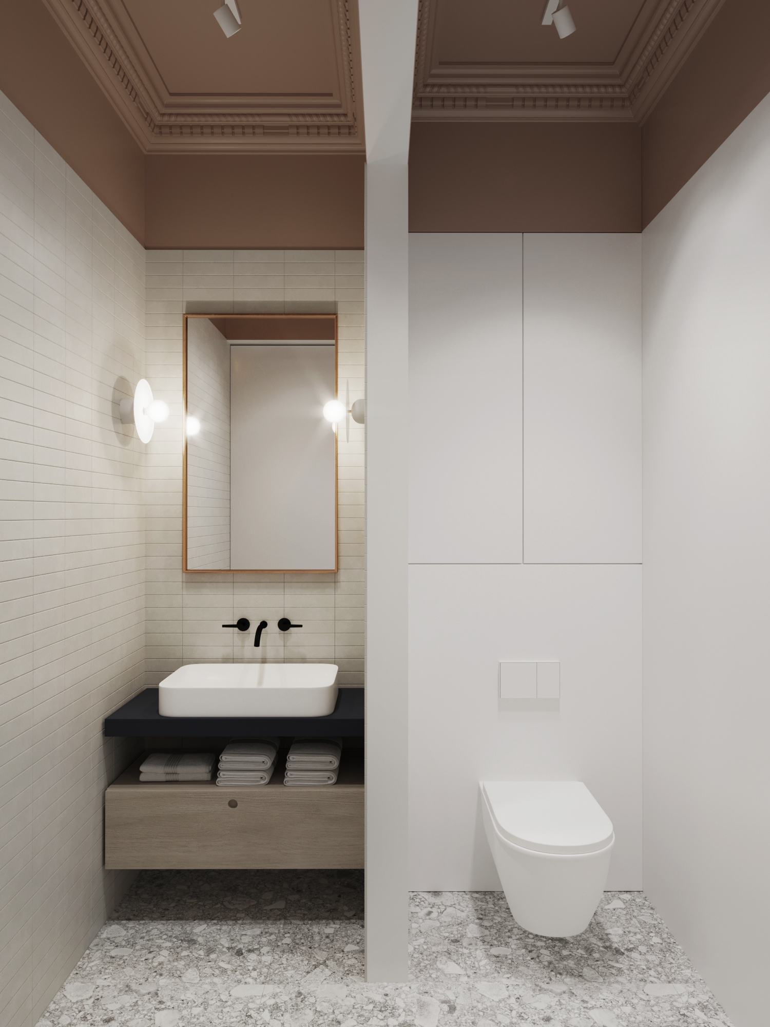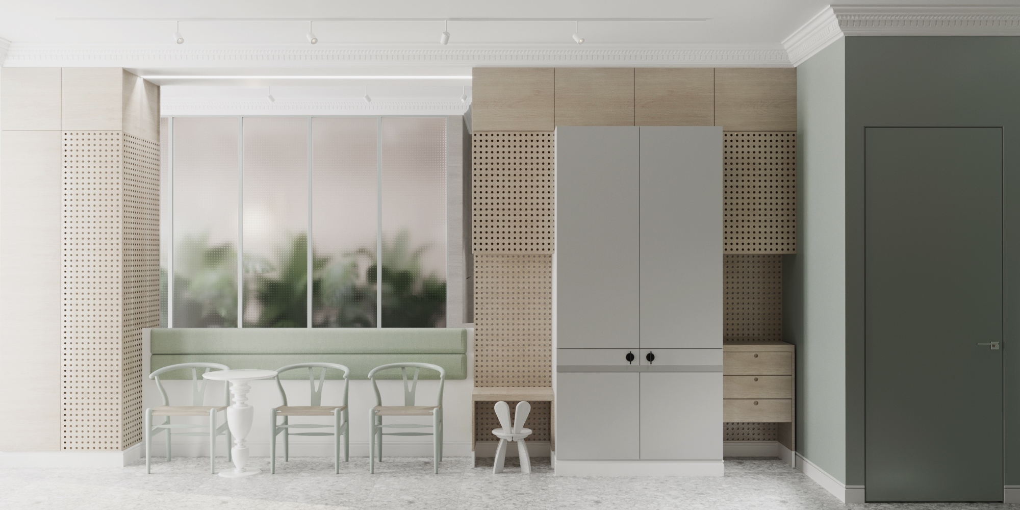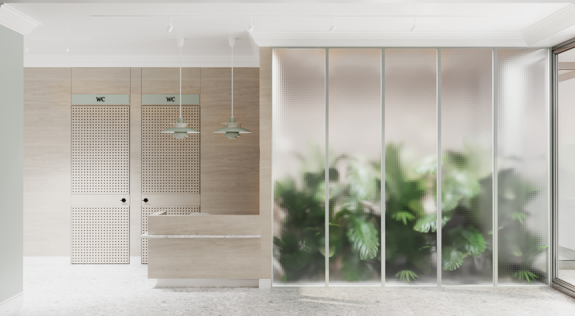 Projekt gabinetów lekarskich o powierzchni 90 m2. Dbamy o to aby każdy projekt gabinetów wychodził poza standardowy schemat estetyki. Tym razem postawiliśmy na delikatne barwy które dają poczucie przytulności i spokoju. Połączenie delikatnych kolorów z naturalnym drewnem oraz cegłą na ścianie w sali szkoleniowej.