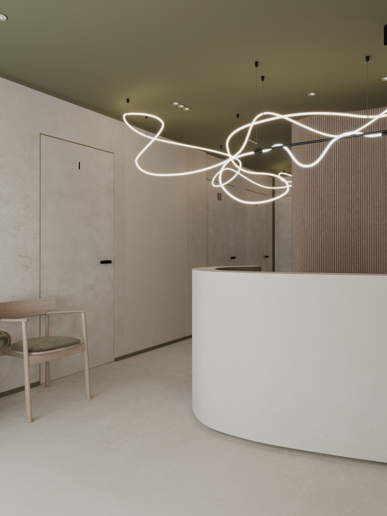 Kolory oraz faktury dobrane odpowiednio do danej przestrzeni. Zieleń w połączeniu z drewnem daje poczucie spokoju. Zależało nam na tym aby nawet ci najmłodsi pacjenci czuli sie bardziej komfortowo w przestrzeni gabinetów medycznych.