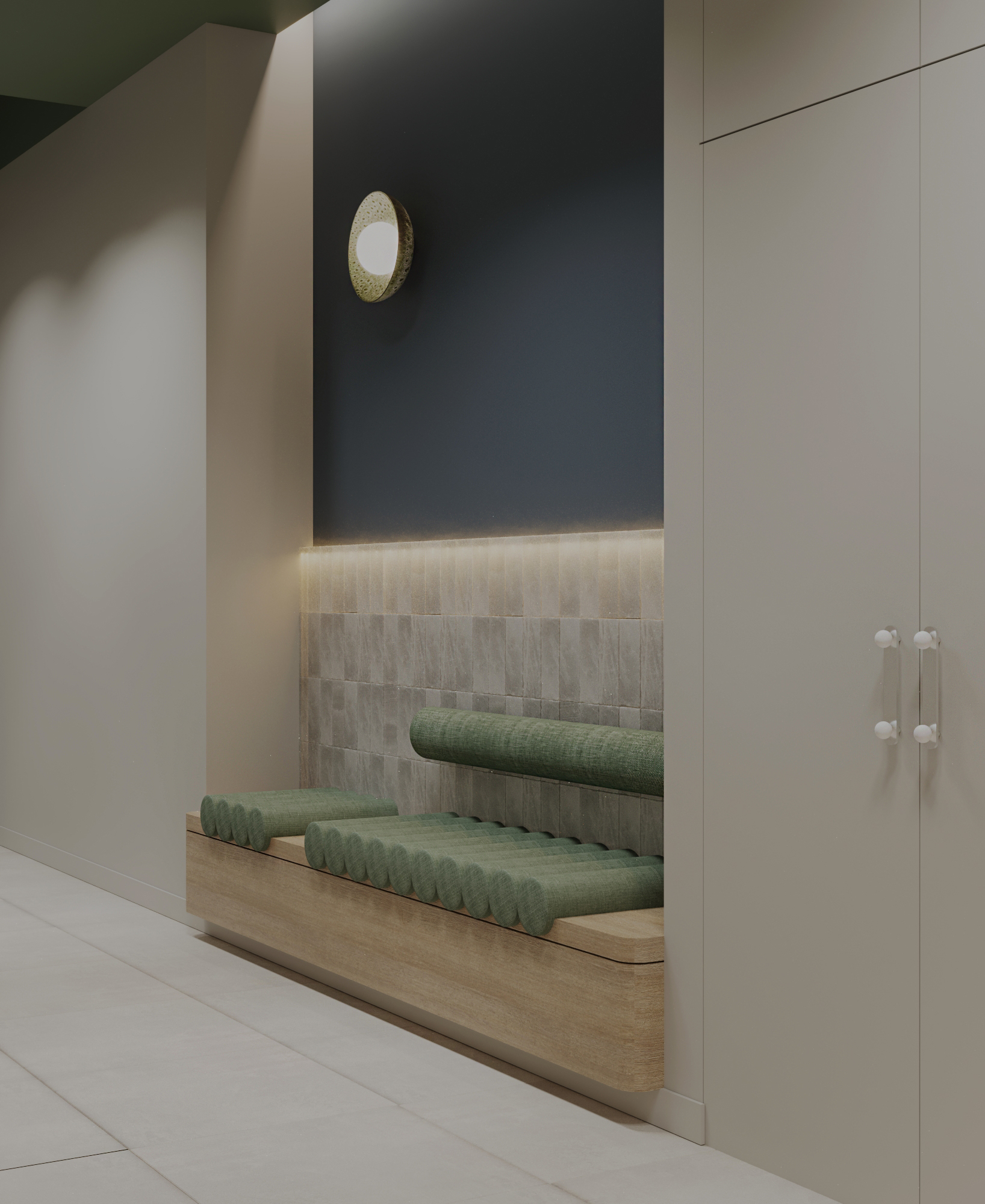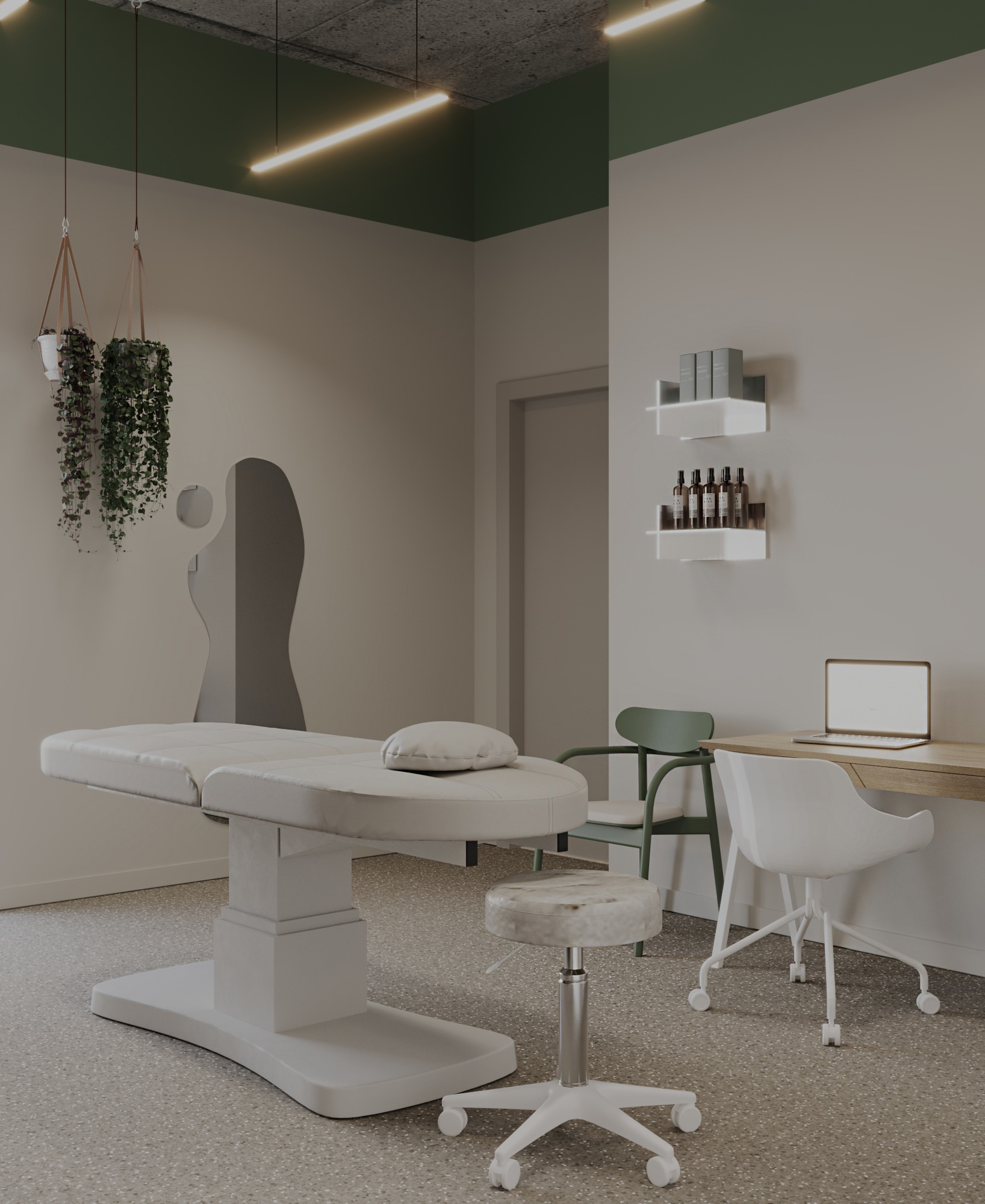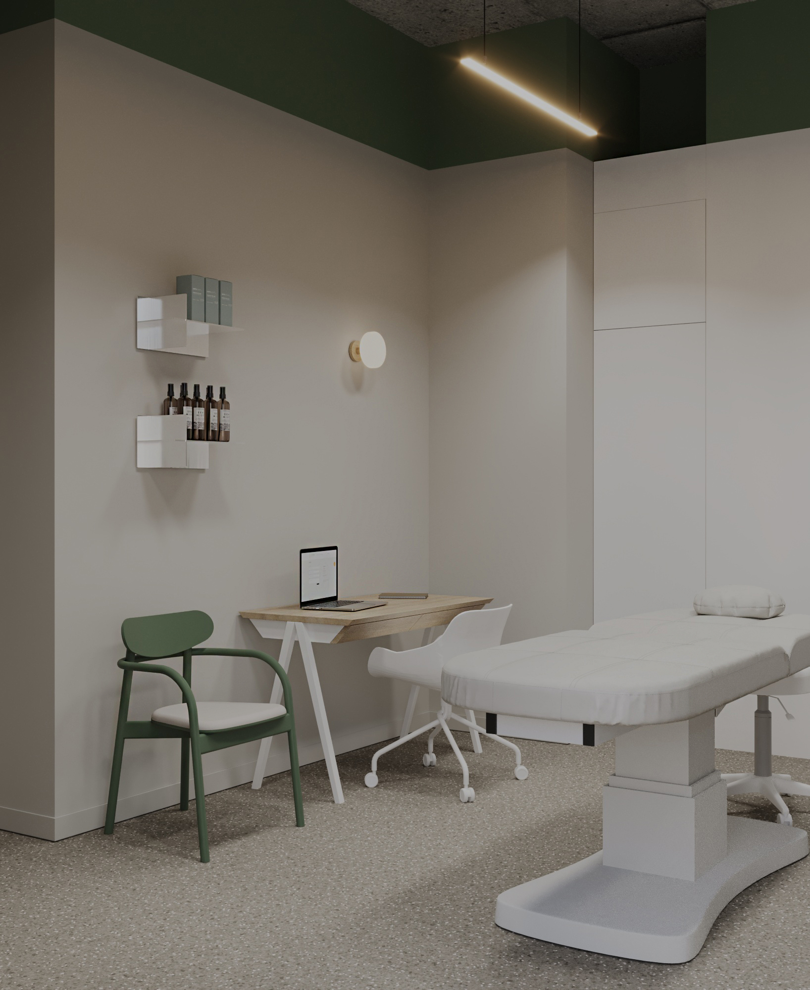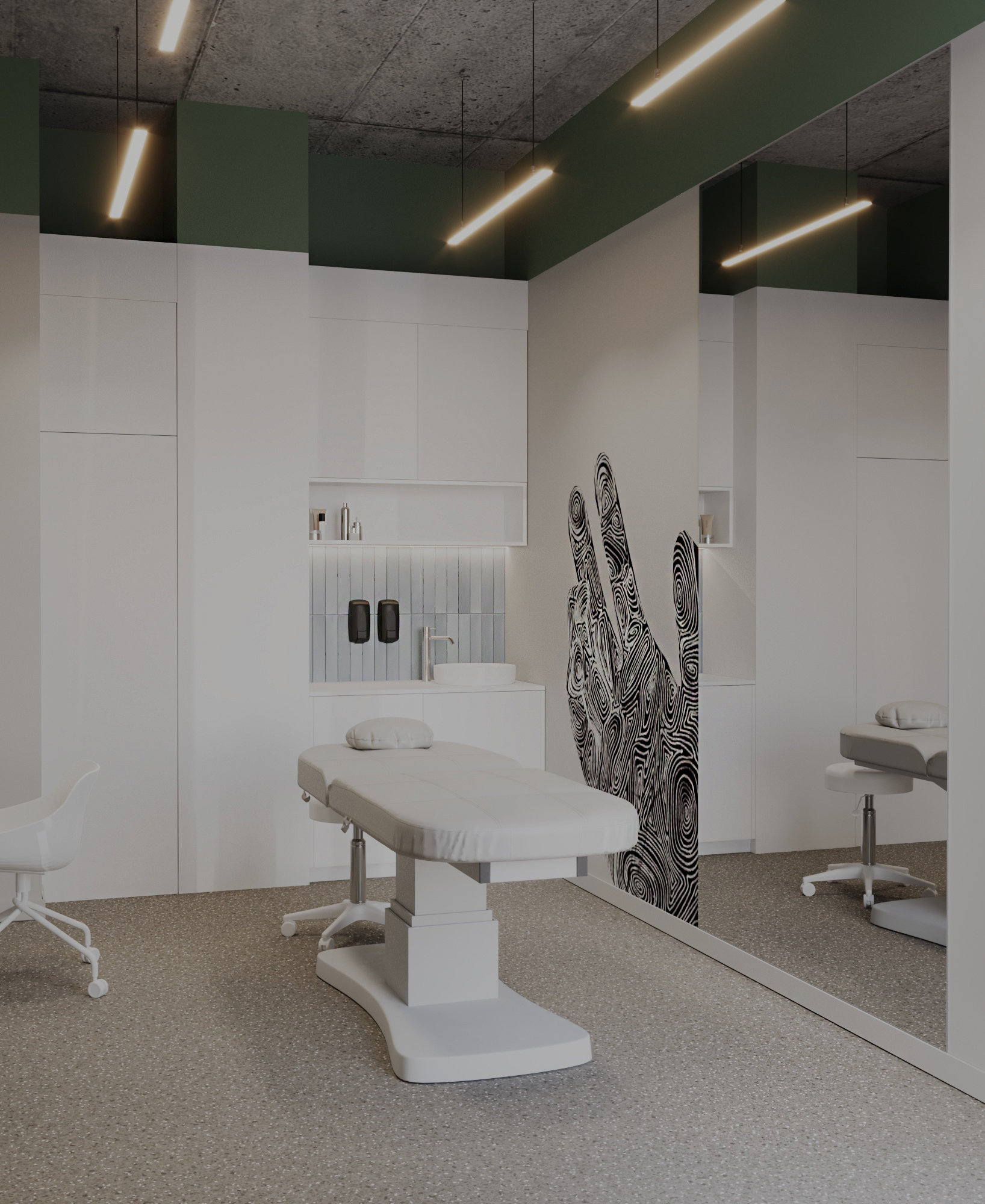 Przestrzeń 140 m2 została podzielona na cztery gabinety zabiegowe, miejsce do odpoczynku po zabiegu, przestrzeń socjalna oraz recepcję.